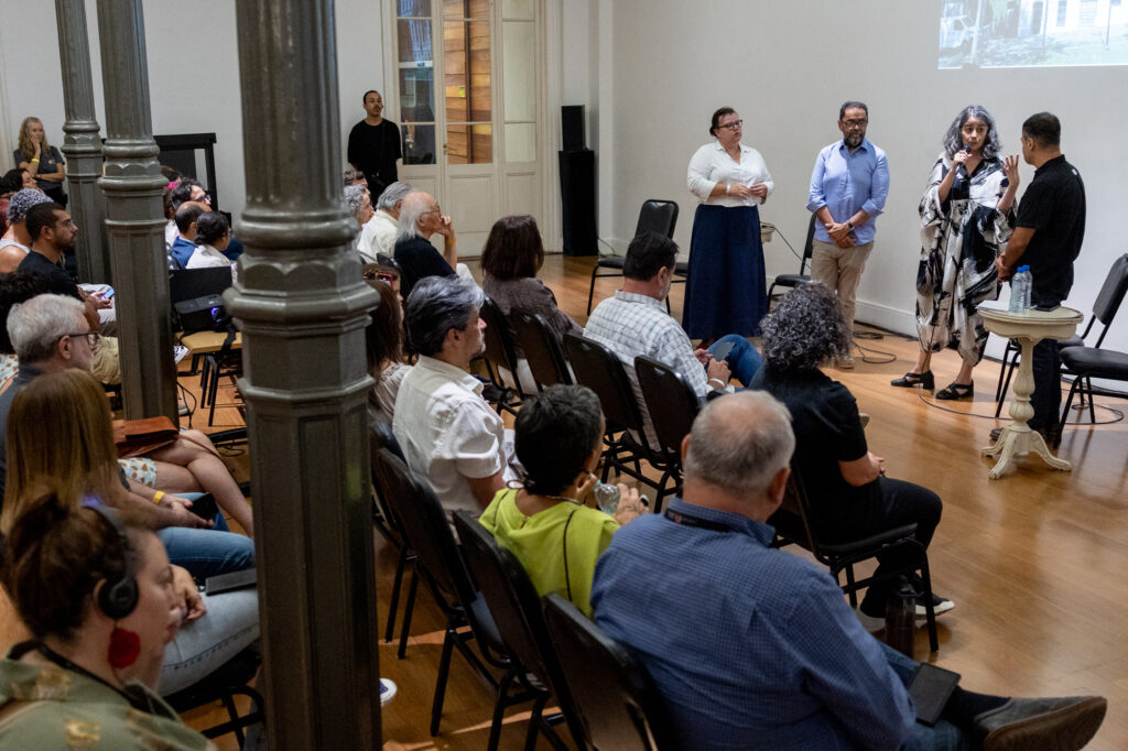 A programação teve início com a mesa-redonda Praça das Artes em Diálogo: Restauro, Acervo e Exposição, que reuniu profissionais diretamente envolvidos na preservação do complexo. Com mediação de Eduardo Spinazzola e Ana Lucia Lopes, o encontro contou com a participação de Toninho Sarasá, Gustavo Kerr e Rafael Araújo, além de representantes das áreas de Arquitetura e Patrimônio e do núcleo de acervo do Theatro.
